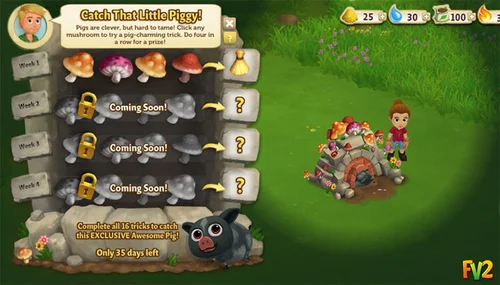 We released our successful "Problem With Pigs" feature in FarmVille2 during the time pigs were released for the first time in our game. We delighted our players with with advent calendar style quest sheet that was released weekly. Each mushroom opened a quest upon click.